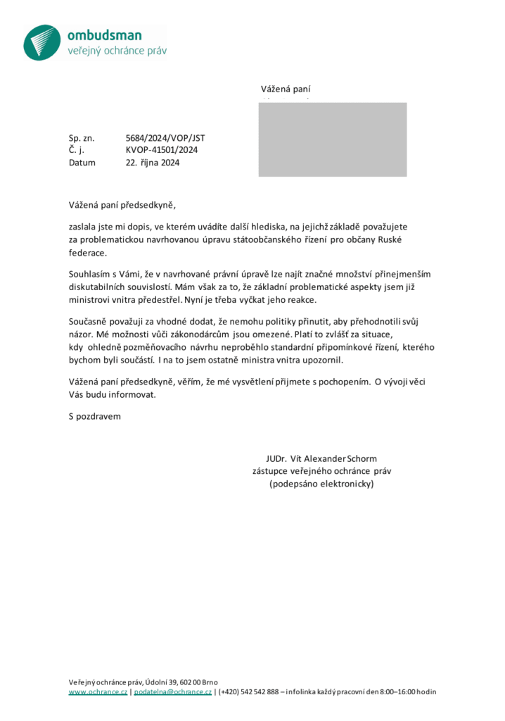 Odpověď veřejného ochránce práv na odvolání:
