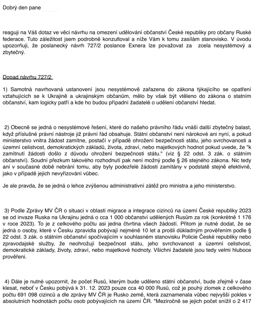 Pozměňovací návrh pana Exnera - jestli by mohl dávat pozor - byl odsouhlasen pozměňovací návrh, který zavádí pro občany Ruské federace en bloc nutnost vzdání se ruského občanství, aby mohli získat občanství České republiky. To je princip kolektivní viny. Já mám tady k tomu nějaké poznámky, které mi psali jak občané, tak i neziskové organizace. Vzdání se ruského občanství je pro mnoho lidí nemožné či nebezpečné. Celá řada z nich jsou kritici Putina. Vy je chcete posílat zpátky do Ruska, aby se vzdali ruského občanství, oni je tam zatknou, už se sem nevrátí. Já mám tady dopisy od lidí, já tomu vůbec nerozumím, jak tohleto chcete odůvodnit.
