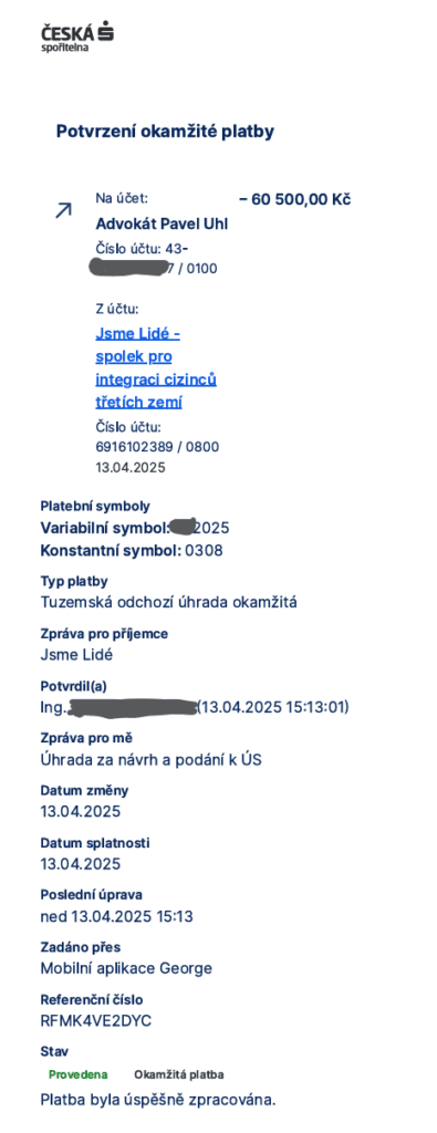 Но это не все хорошие новости! Сполку Jsme Lidé наконец-то открыли счет. Теперь вы можете присылать свои донаты на работу адвоката. Необходимая первоначальная сумма (за написание и подачу стижности в КС) – 60500 крон.
